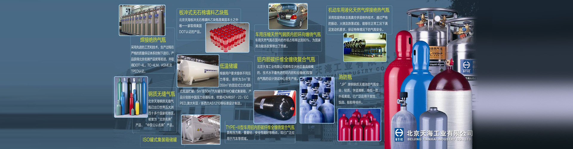 完美电竞官网(中国)官方网站(以下简称“天海工业”)是北京京城机电控股有限责任公司所属北京京城机电股份有限公司(简称京城股份,H股证券代码00187,A股证券代码600860)主要骨干企业,是拥有七个专业气体储运装备生产基地(天海氢能、上海天海、天津天海、宽城天海、明晖天海、天海低温、江苏天海)及一个美国公司的集团公司。天海工业及下属子公司具有A2级高压容器、B1级无缝气瓶、B2级焊接气瓶、B3级纤维缠绕气瓶、B4级低温绝热气瓶、B5级溶解乙炔气瓶、C2级罐式集装箱、D级中低压容器的设计和生产资质。可生产800余个品种规格的钢质无缝气瓶、玻璃纤维环向缠绕气瓶、碳纤维全缠绕复合气瓶(含三型瓶、四型瓶、呼吸器)、无石棉填料乙炔瓶、焊接气瓶、完美电竞官网(中国)官方网站(含车用)、固定式压力容器、低温罐式集装箱、船用罐、CNG/LNG/H2车载供气系统及加气站等系列产品,广泛应用于汽车、化工、消防、医疗、石油、能源、城建、食品、冶金、机械、电子等行业。